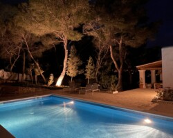The 25 ares of garden welcomes the private pool, sunbeds, exterior shower, sofas, all in a wooded decor of pines and local cactus with a distant sea view.